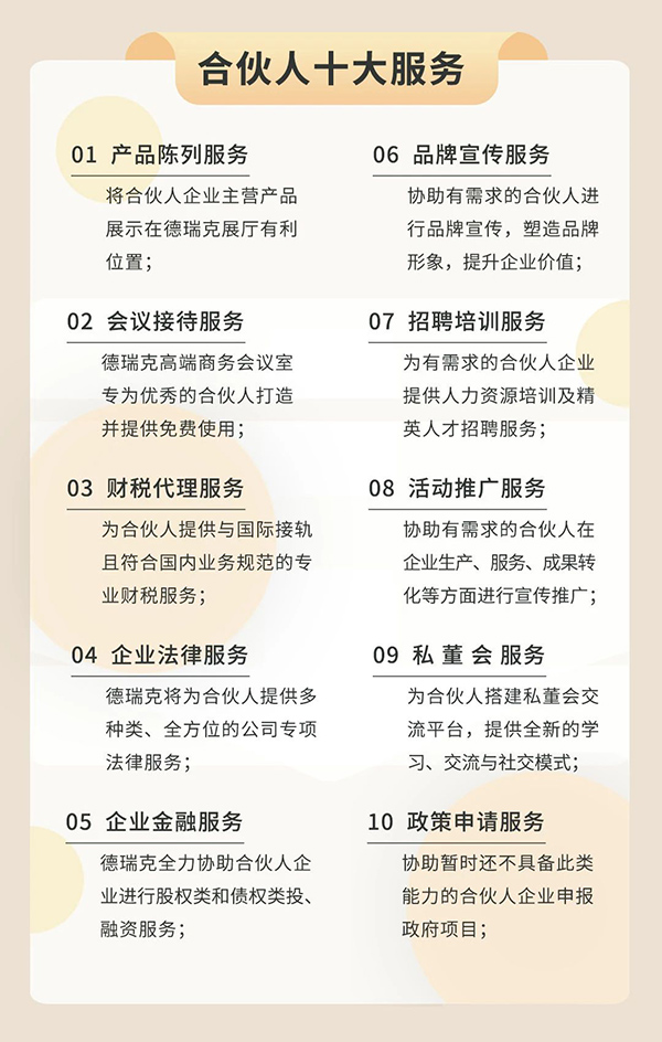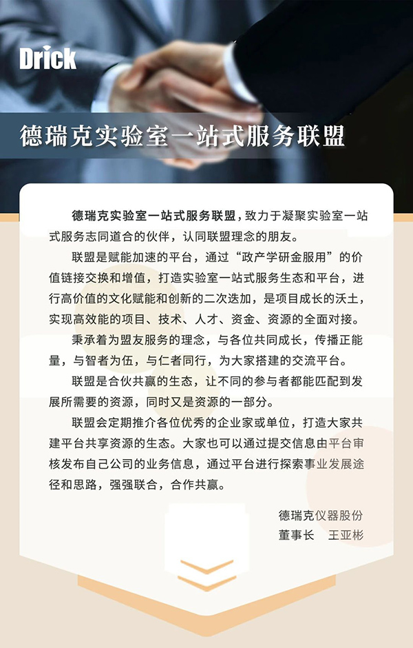 德瑞克實驗室一站式服務聯(lián)盟,致力于凝聚實驗室一站式服務的核心戰(zhàn)友、志同道合的伙伴,認同聯(lián)盟理念的朋友。通過政產學研金服用的價值鏈接,打造實驗室一站式服務生態(tài)和平臺,讓不同的合作機構,單位,企業(yè),個人得到發(fā)展的機遇和發(fā)展的空間。聯(lián)盟是一個生態(tài),讓不同的參與者都能匹配到發(fā)展所需要的資源,同時又是資源的一部分。此外,聯(lián)盟還會定期推介各位優(yōu)秀的企業(yè)家和其企業(yè)的主營業(yè)務,打造“共建平臺、共享資源"的聯(lián)盟新生態(tài)。