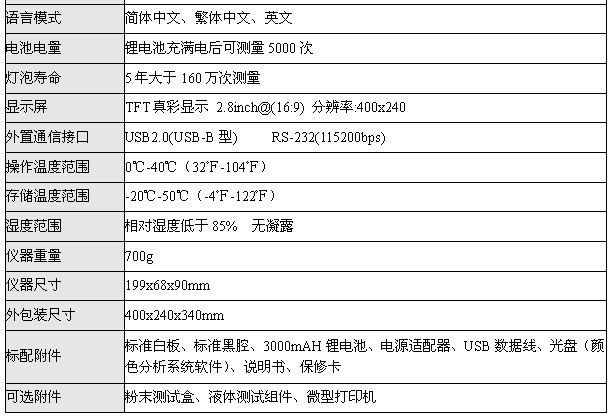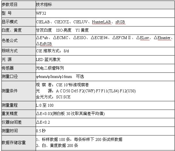 WF32色差儀是一款高精度、高穩(wěn)定性、多功能的色差儀。WF32擁有8種測(cè)量光源(A、D50、D65、C、F2、F7、F11和F12);六種顯色模式(CIE1976LAB、CIEXYZ、CIELUV、HunterLAB、sRGB、白黃度);八種色差公式(△E*ab、△ECMC、△EISO、△ECIE94、△EFCMⅡ、△ELuv、△Ehunter、△EsRGB);三種語(yǔ)言模式(簡(jiǎn)體中文、繁體中文和英文);有三種測(cè)量口徑供用戶(hù)選擇。WF32色差儀還能進(jìn)行白黃度測(cè)量和平均測(cè)量,有大容量數(shù)據(jù)存儲(chǔ)空間,也可以外接微型打印機(jī)進(jìn)行測(cè)量數(shù)據(jù)的實(shí)時(shí)打印,并能與儀器標(biāo)配的《顏色分析系統(tǒng)》軟件配合使用。